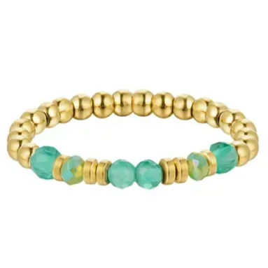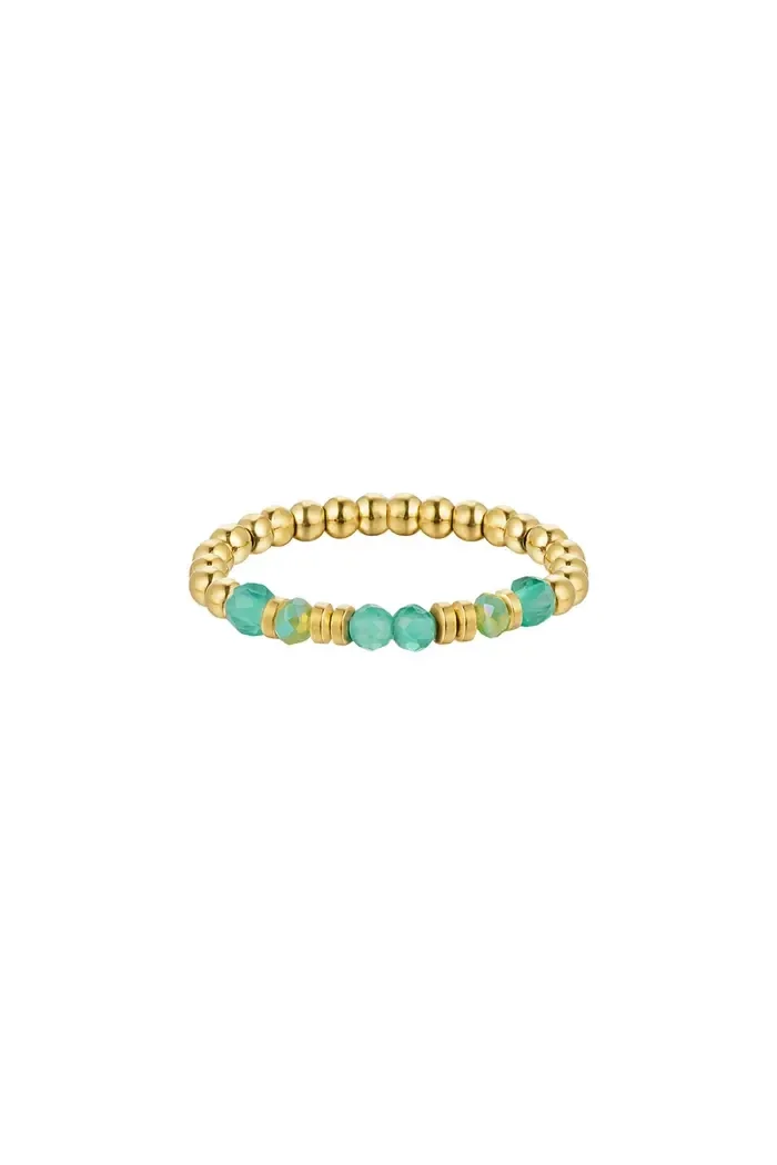 Hoe leuk is deze schattige kralen ring in de kleuren goud met groen en zilver! De ring is perfect te combineren met meerdere sieraden en is eenvoudig te verstellen dankzij het elastiek! De ring is gemaakt van hematiet, kristalkralen en aventurijn en is onderdeel van de natuurstenen collectie! Erg leuk om deze ring te combineren met meerdere natuurstenen sieraden.