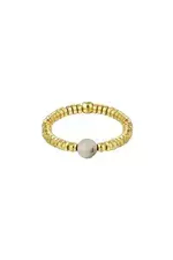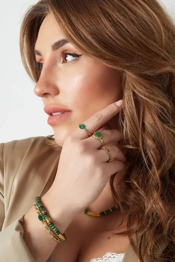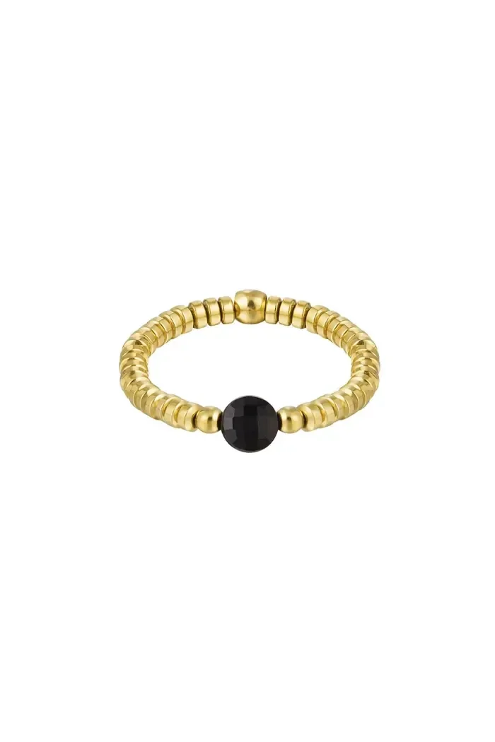 Hoe tof is deze elastieken gouden ring met zwarte grote steen. De ring beschikt over kleine kraaltjes waardoor er een speels effect wordt gecreëerd. De ring is perfect te combineren met meerdere ringen. Ook leuk om deze ring met meerdere zwarte sieraden te combineren voor een toffe look! De ring is gemaakt van hematiet in combinatie met zwarte agaat. Je shopt deze toffe ring in de volgende kleuren: zwart - groen - lichtgroen - roze - wit.